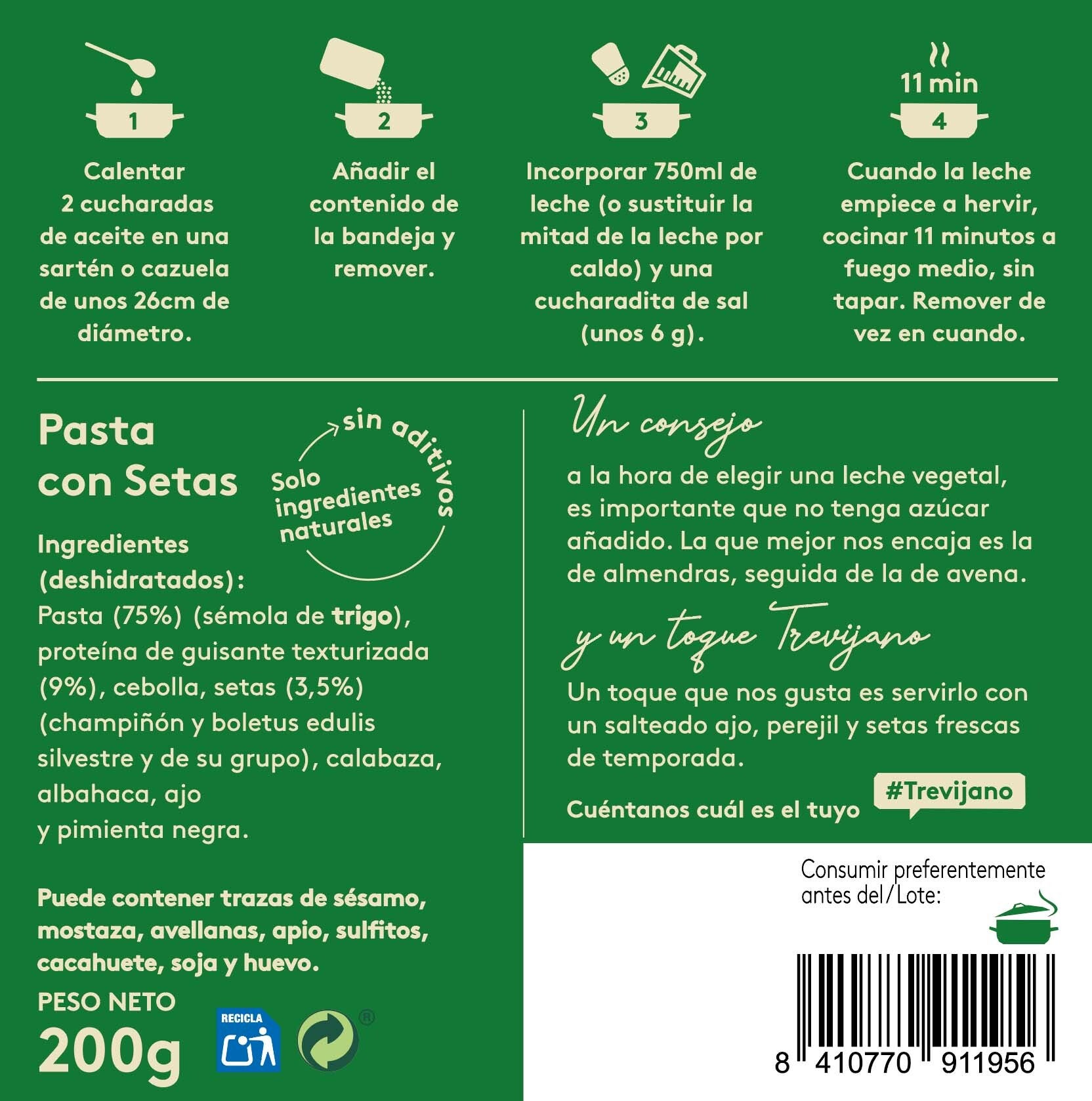 Ingredientes: Pasta, proteína de guisante texturizada, cebolla, champiñón, boletus, calabaza, albahaca, ajo, pimienta negra… y nada más.