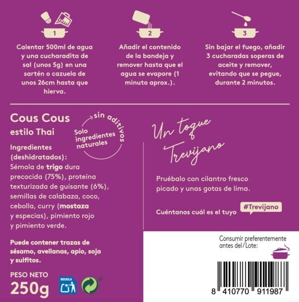 Ingredientes: Cous cous (trigo), proteína texturizada de guisante, semillas de calabaza, coco, cebolla, curry (mostaza y especias), pimiento rojo y pimiento verde… y nada más.